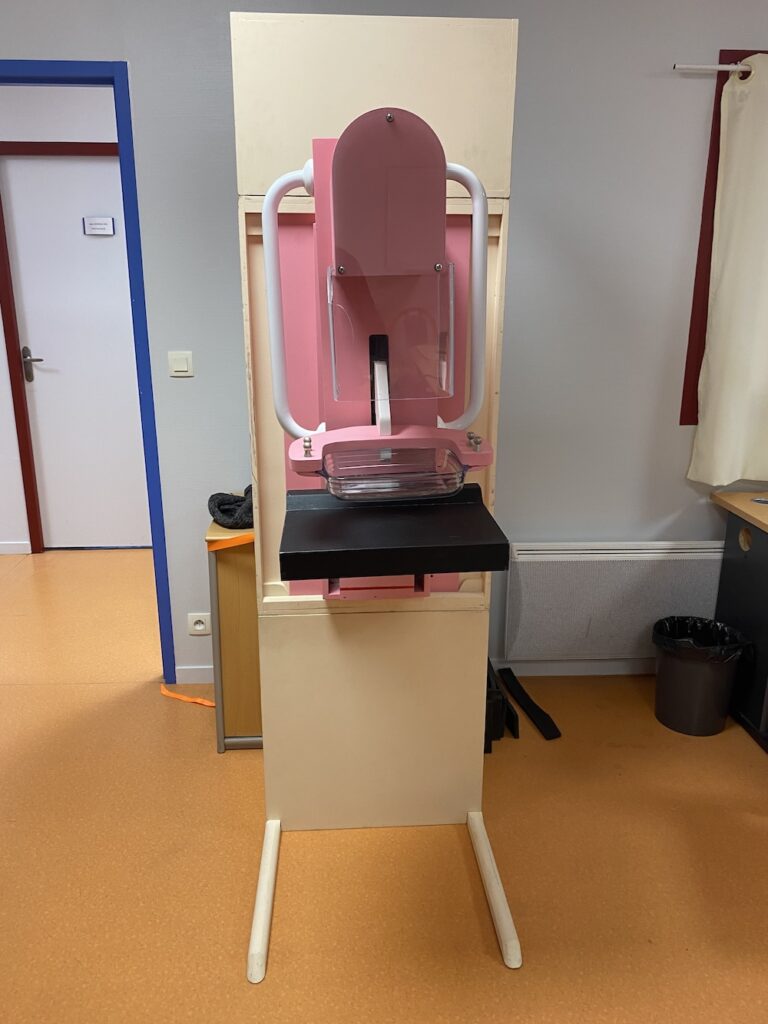 Cette présentation, animée par Hélène GEURTS du RSVA (Réseau de Services pour une Vie Autonome) et Dominique INGOUF de la Ligue contre le cancer avait pour but d’expliquer à toutes les femmes de l’AMSH, de tous les établissements (les 2 sites ESAT + Hébergement ESAT + Foyer de Vie), comment se déroule concrètement une mammographie avec l’aide d’un mammographe plus vrai que nature (réalisé en bois, à taille réelle et motorisé).